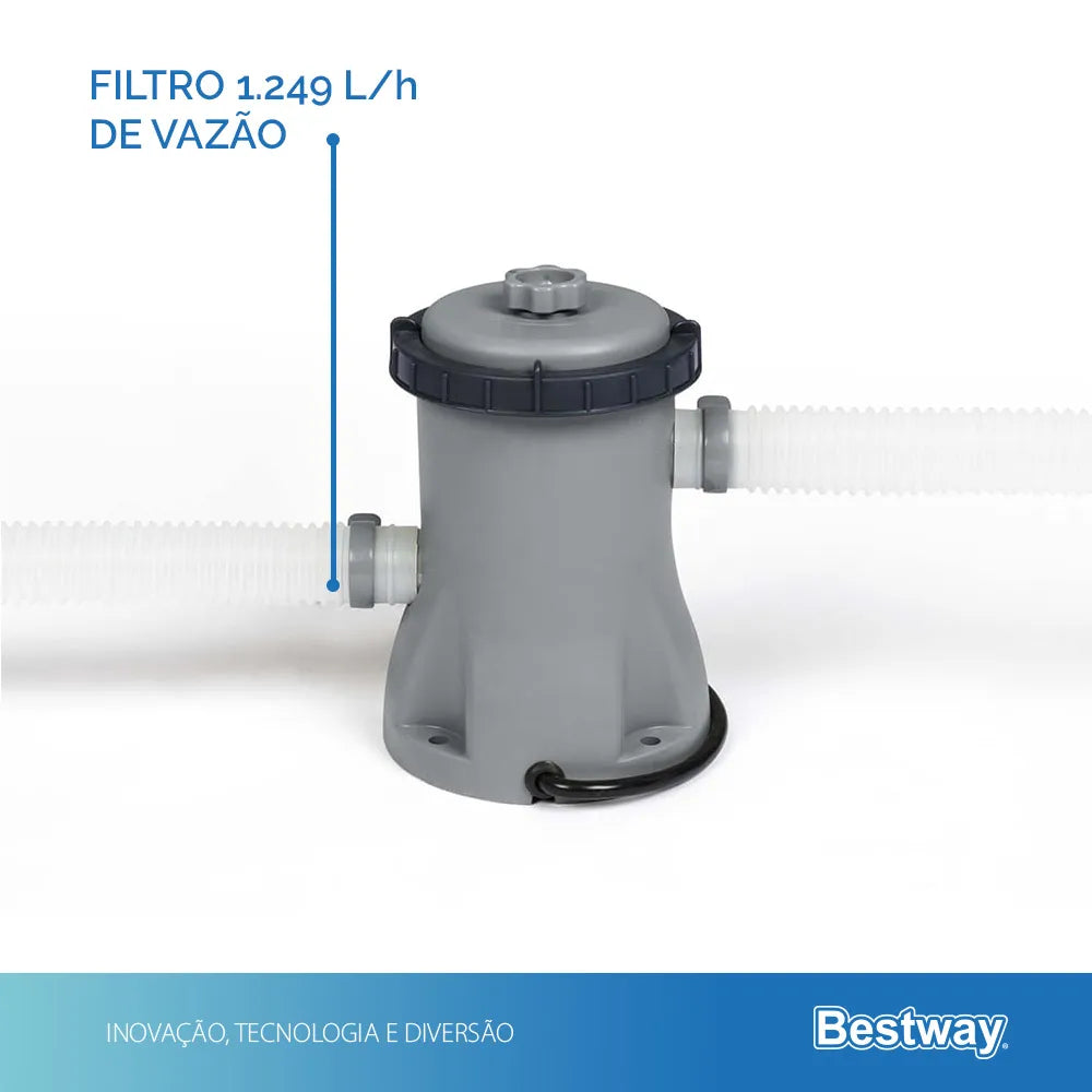 Acompanha filtro de 2.006 L/h para manter a água sempre limpa, além de capa protetora e lona para montagem, oferecendo comodidade e mais segurança no dia a dia. Ideal para famílias que buscam conforto, resistência e estilo.